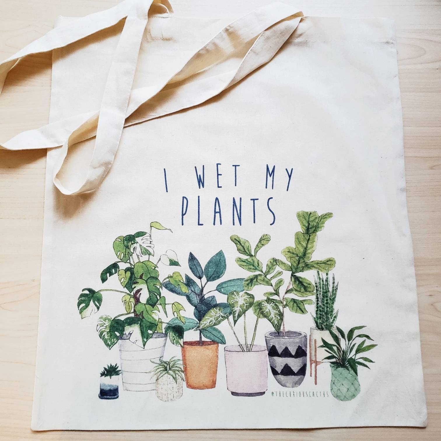 I wet my plants - funny plant pun tote bag for a plant lover. My original design on a tote bag!